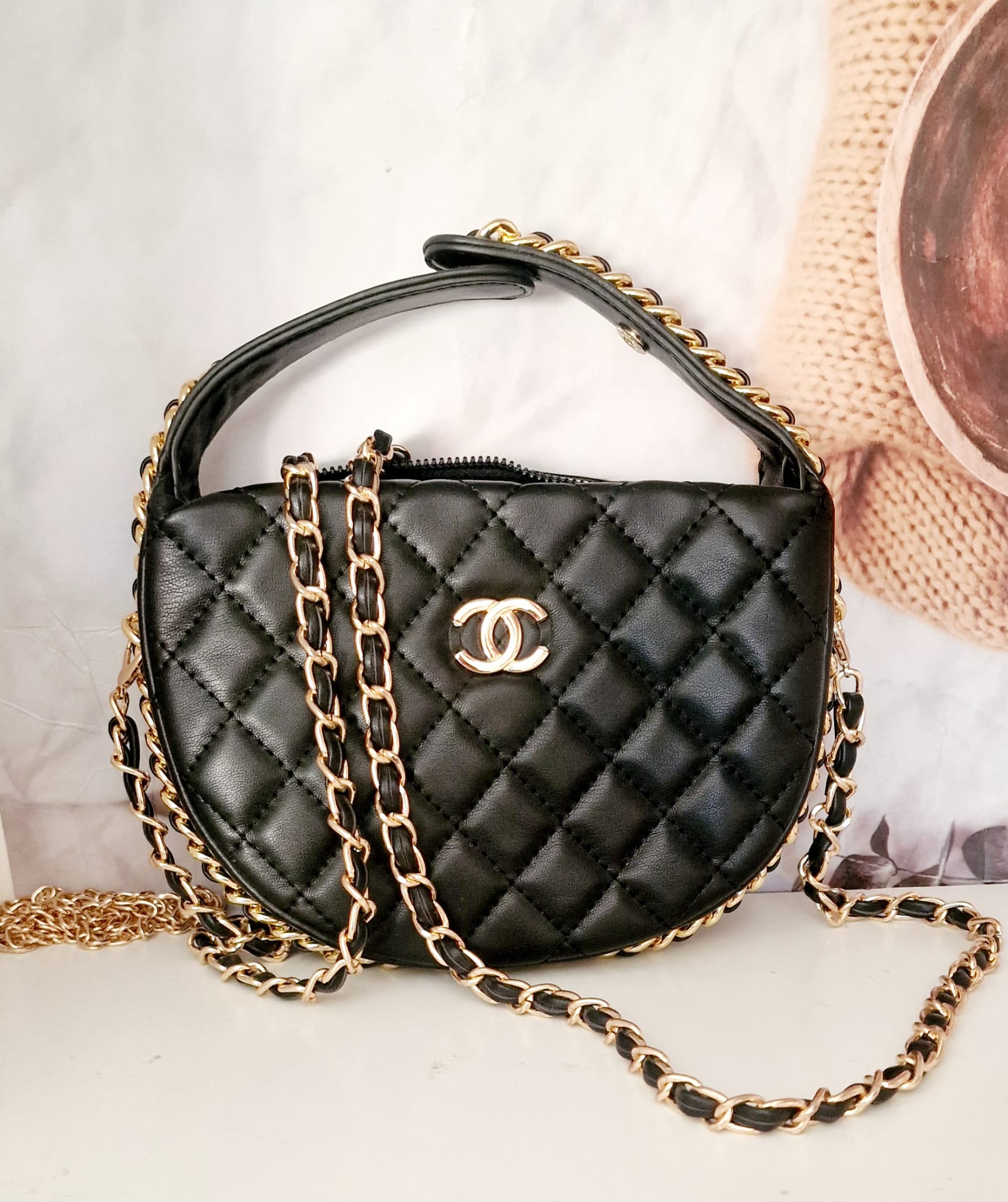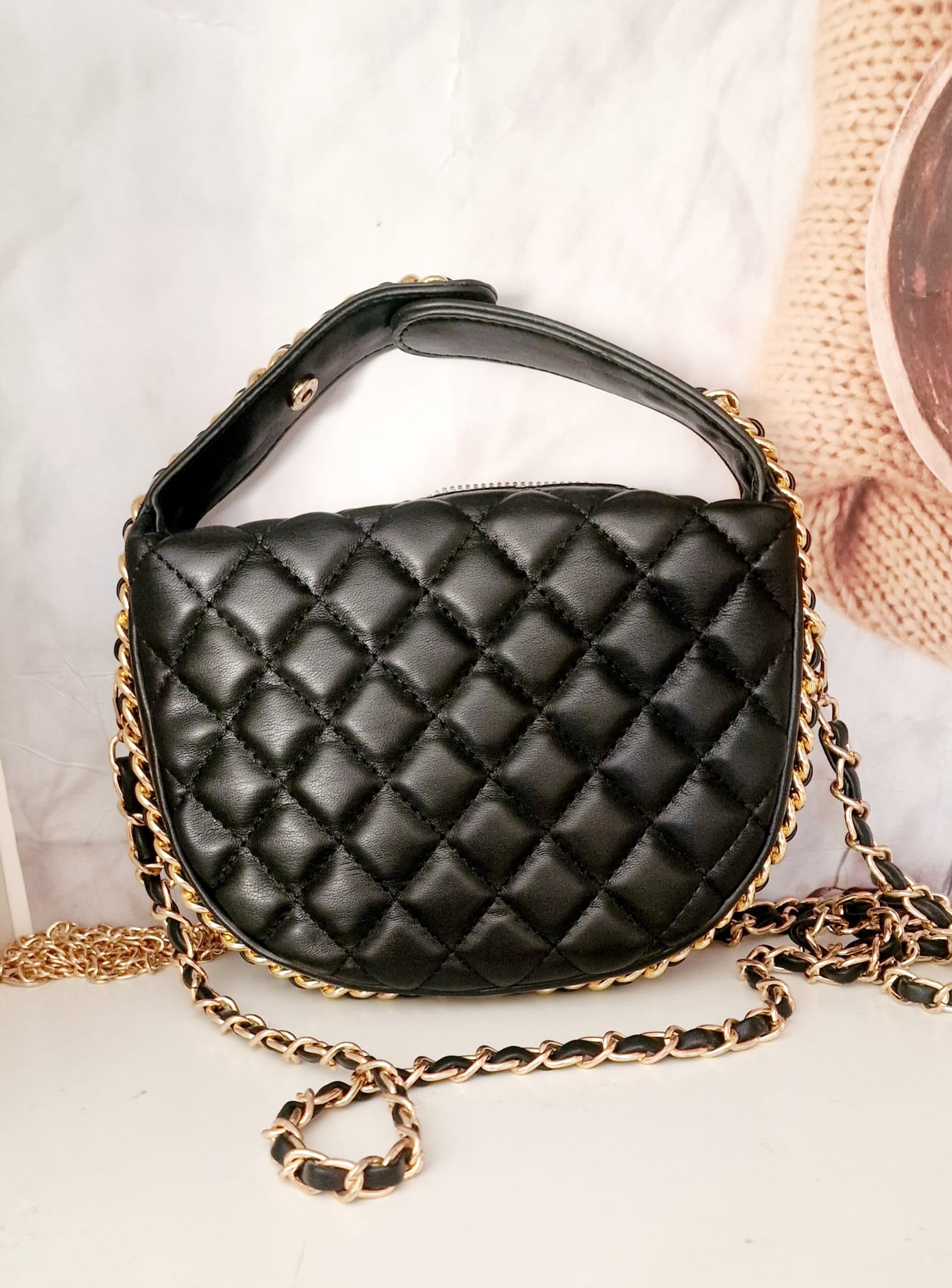 Un bolso elegante con un diseño acolchado que nunca pasa de moda. Su tamaño compacto y su estructura semicircular lo hacen perfecto para llevar lo esencial con clase. La cadena dorada con detalles en cuero añade un toque de lujo, ideal para complementar outfit tanto casuales como formales.