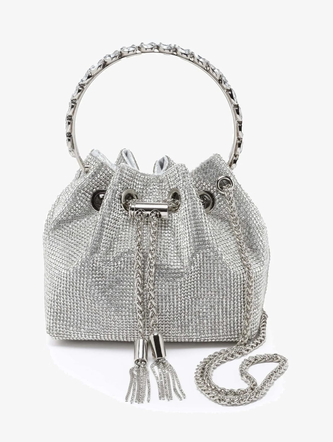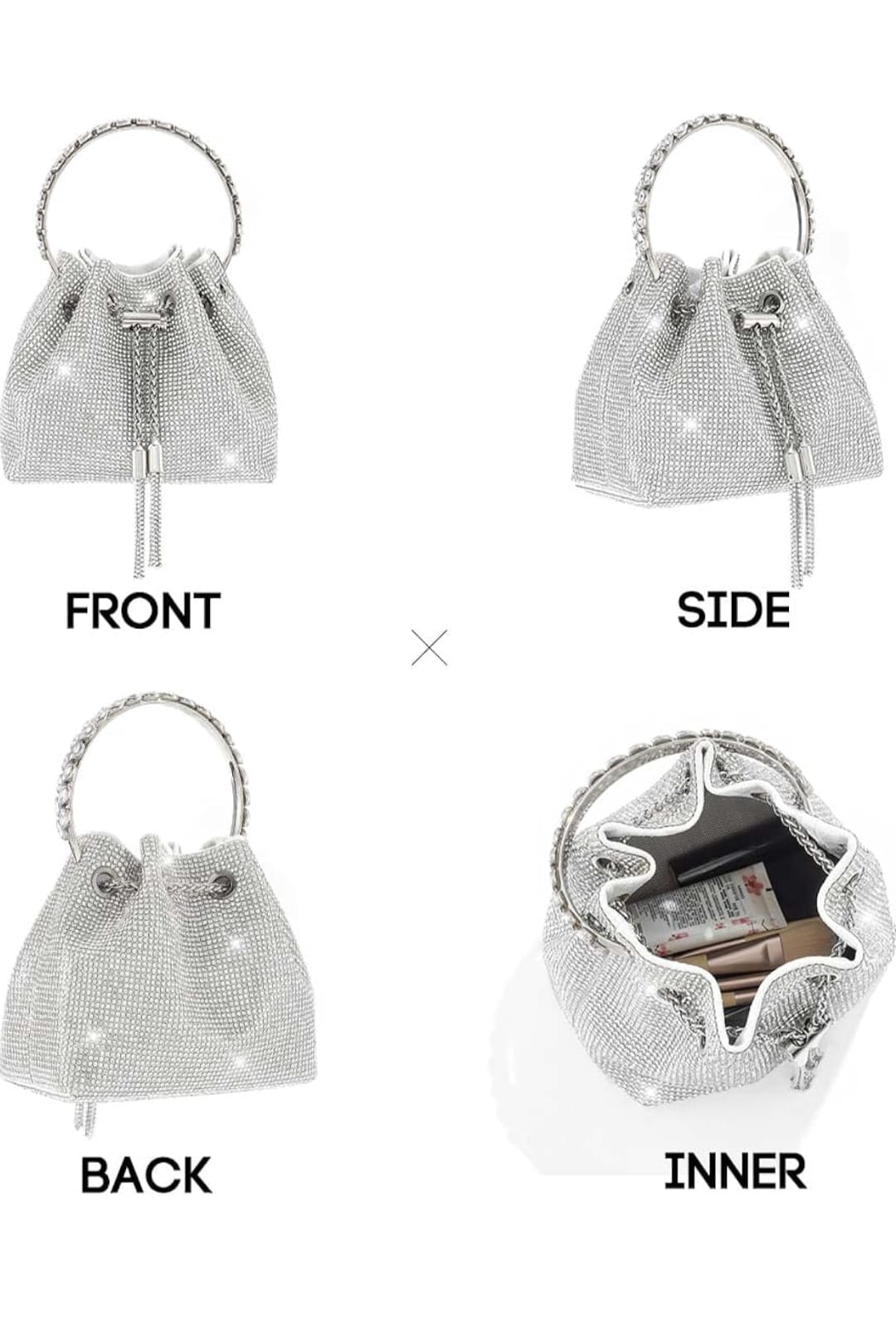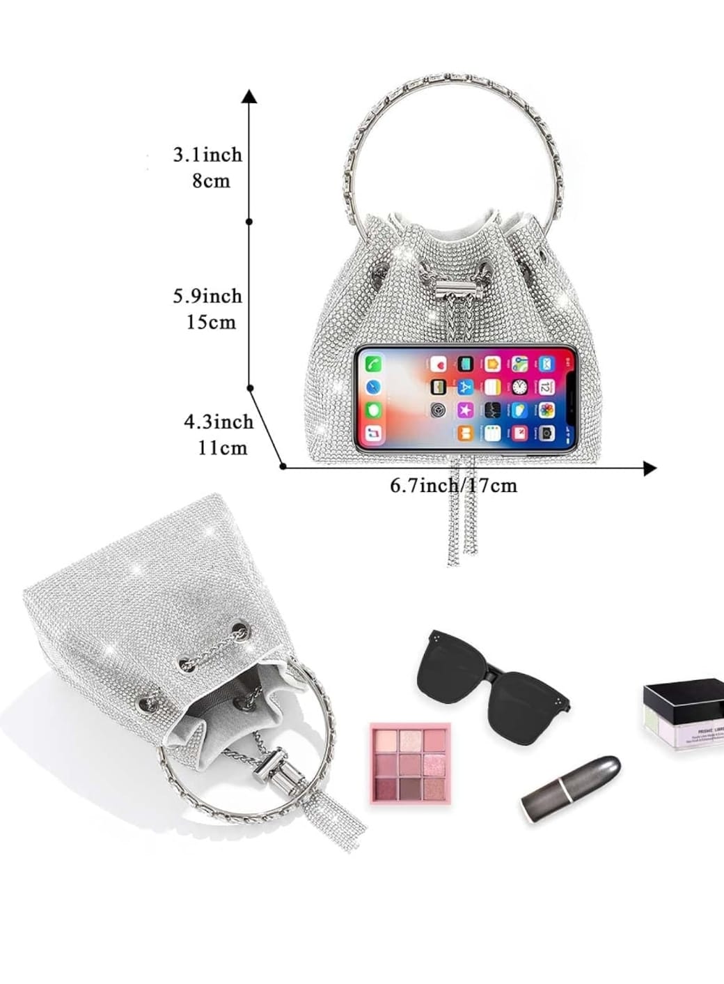 Añade un toque de lujo a tu estilo con un bolso de noche tipo saco diseñado para brillar en cada paso. Su exterior cubierto de pedrería resplandeciente y su asa metálica elegante lo convierte en el complemento perfecto para eventos especiales con un práctico cierre ajustable y detalles de cadena colgante, este accesorio es funcional.