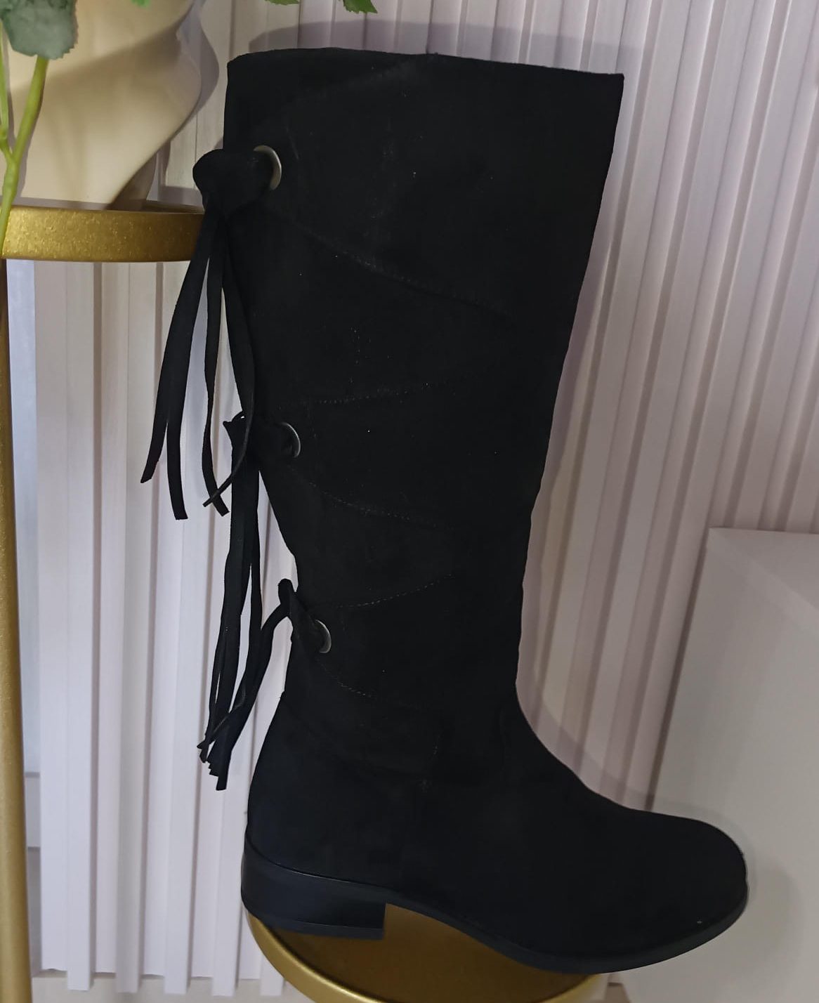 Esta bota alta en color negro combina un estilo bohemio con un toque moderno y versátil. Confeccionada en gamuza sintética, destaca por sus detalles de cordones cruzados y flecos en la parte trasera, que le aportan movimiento y carácter. Ideal para looks otoñales o invernales, se adapta fácilmente a vestidos, jeans o faldas para un outfit casual con mucha personalidad.