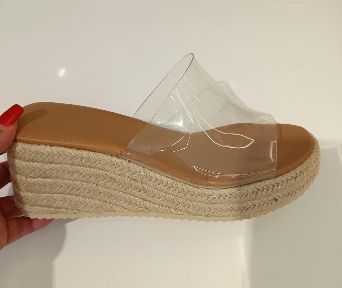 Nuestro modelo ARUBA combina la elegancia de una tira transparente que deja ver el pie con la comodidad de una plataforma de esparto trenzado.