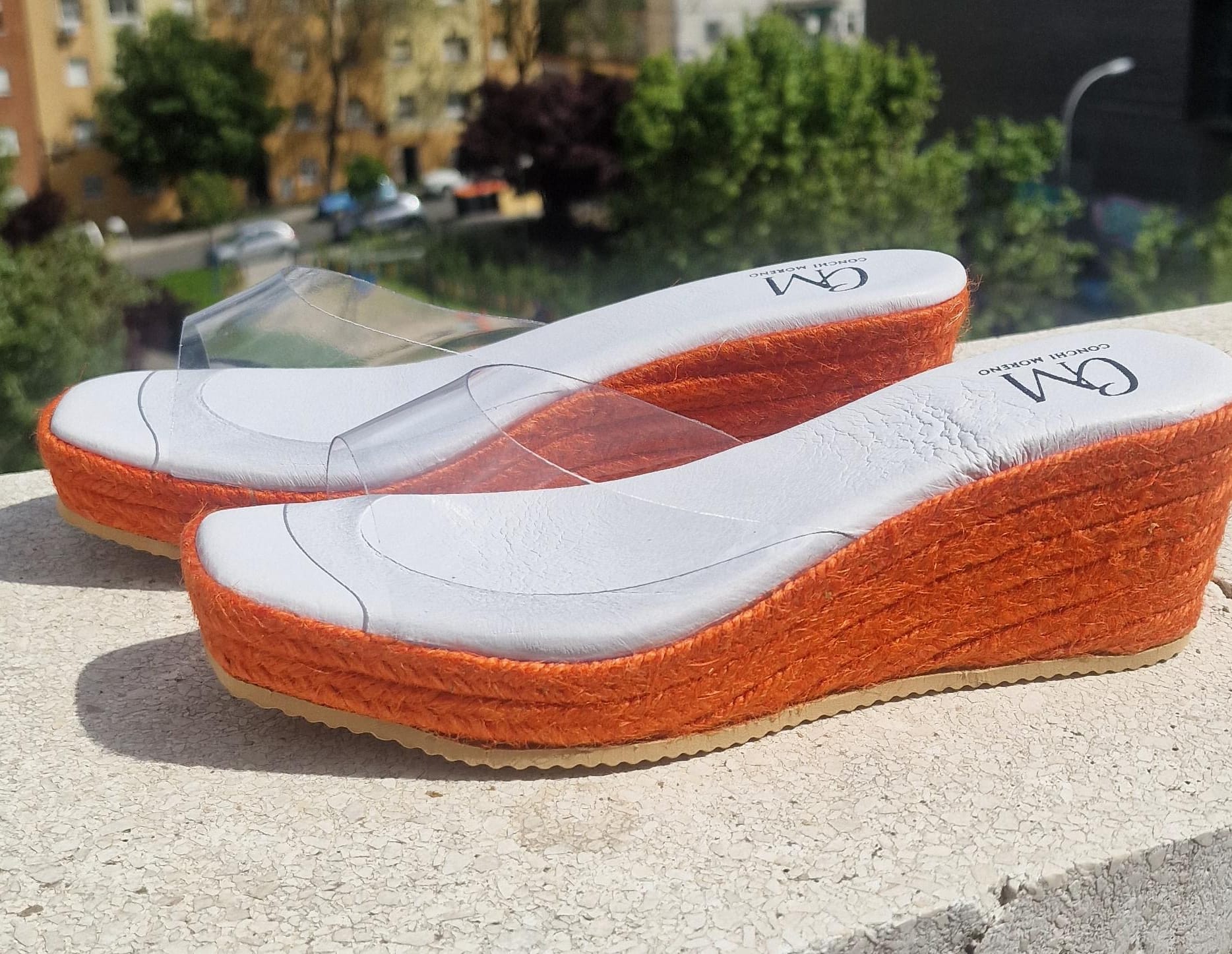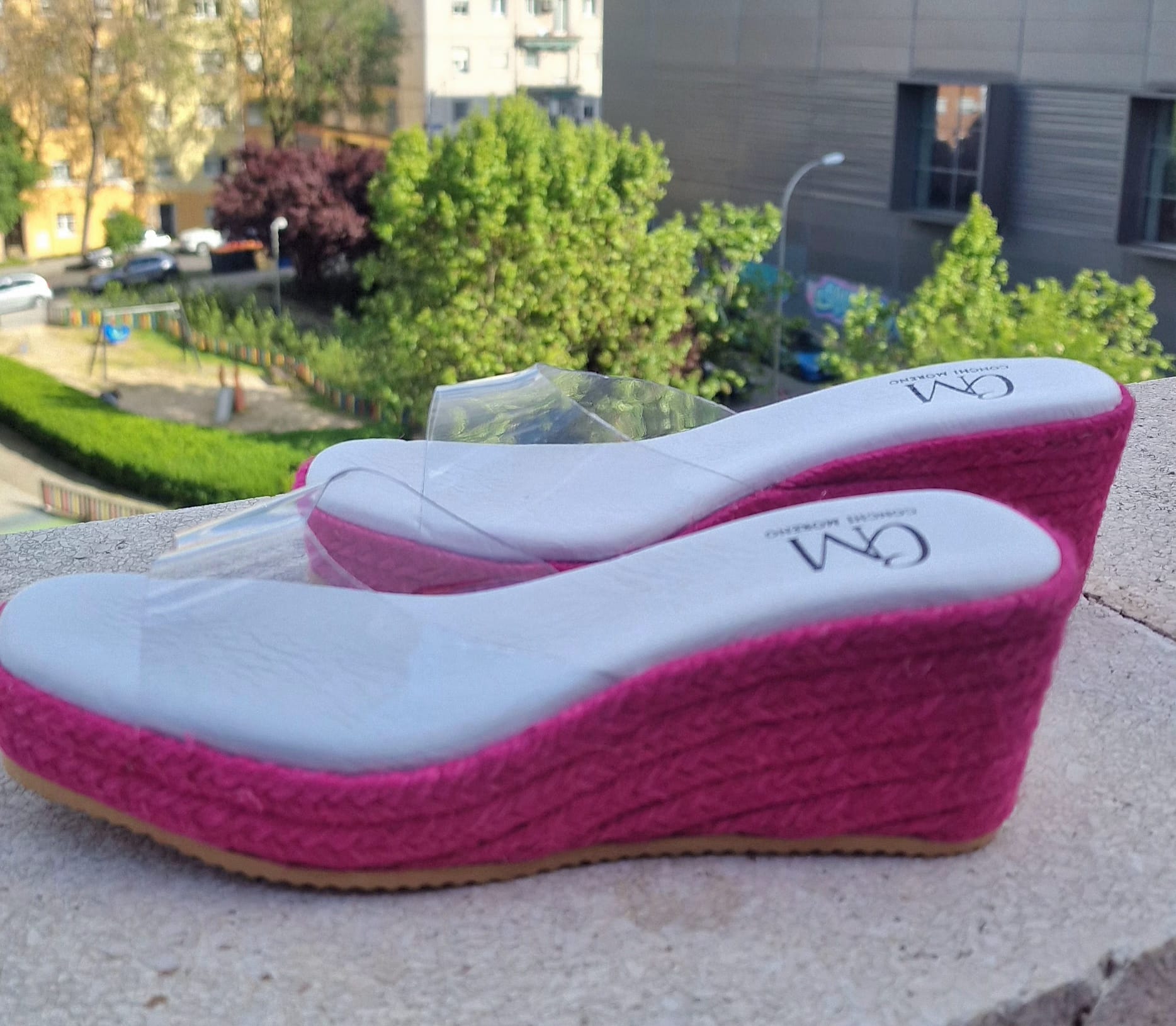 Dale un toque vibrante y moderno a tus looks con nuestras cuñas en tono fucsia o naranja. El diseño combina la comodidad de la plataforma de esparto forrada en color con la elegancia minimalista del vinilo transparente, que estiliza y alarga visualmente el pie. Perfectas para combinar tanto con vaqueros como con vestidos veraniegos. Son un básico de temporada.