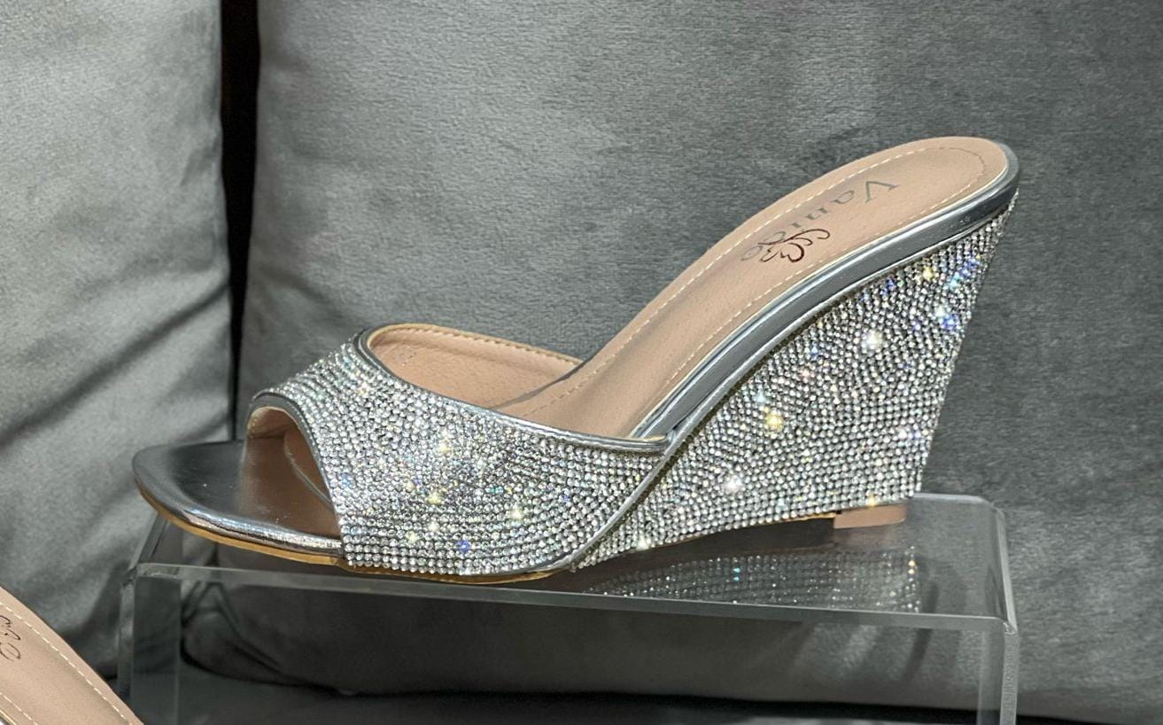 Añade un toque de lujo y esplendor a tu colección de calzado con nuestras cuñas en oro y plata adornadas con piedras.