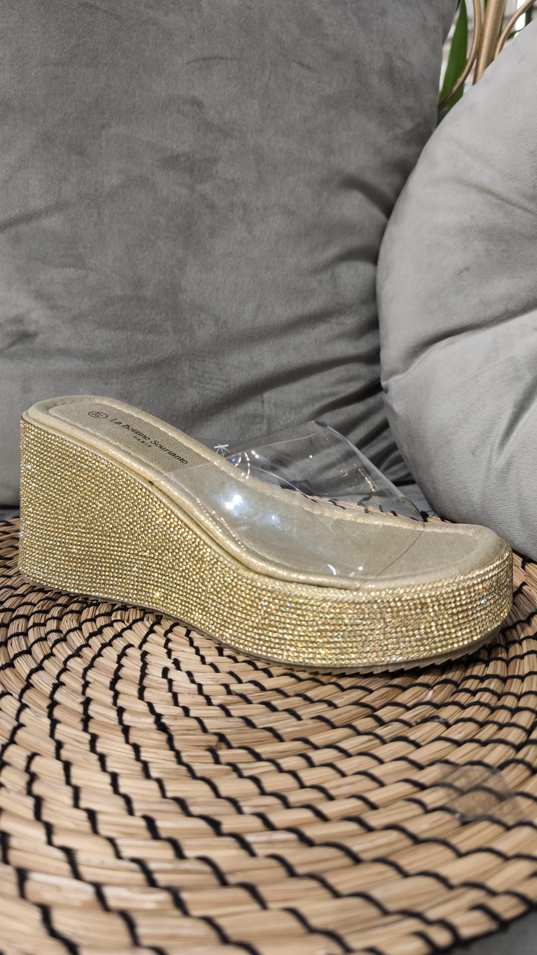 Eleva tu estilo con esta sandalia plataforma de diseño sofisticado y moderno. Su base completamente revestida de cristales aporta un brillo espectacular, ideal para looks de noche, eventos especiales o para darle un toque glam a tus outfits diarios.