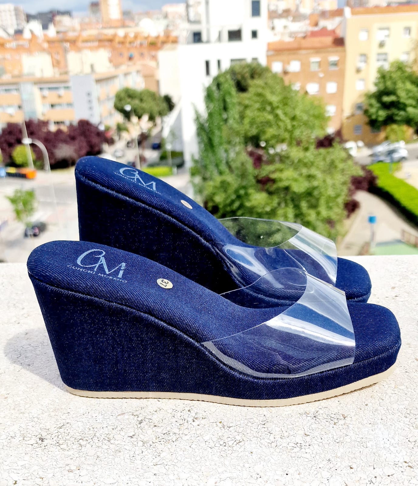 Eleva tu vestimenta con las cuñas NAVY BLUE, un modelo atrevido y actual que combina estilo y confort. Su plataforma alta y baja en tono azul denim aporta un aire juvenil y moderno mientras que la banda transparente ofrece un acabado limpio y versátil que se adapta a cualquier outfit. Ideales para llevar tus vestidos, jeans o faldas, estas sandalias son tu aliada perfecta para destacar en días soleados con máxima comodidad.