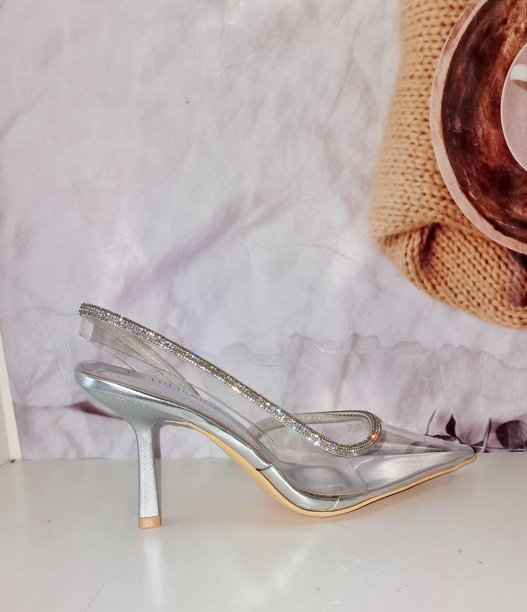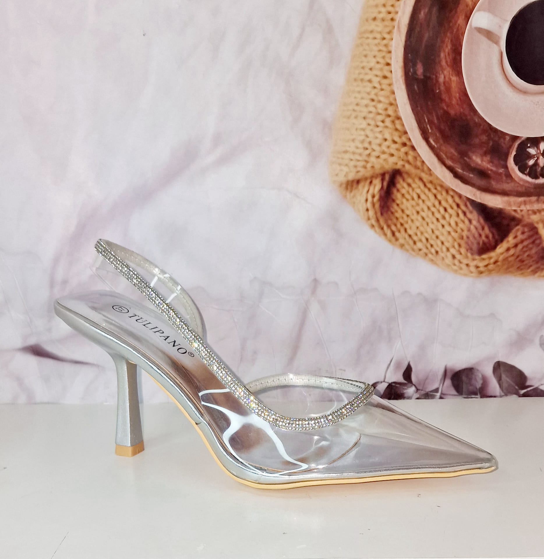 Estos stilettos son la mezcla perfecta entre elegancia y modernidad. Con un diseño transparente que realza la delicadeza del pie, y toques plateados brillantes que capturan la luz en cada movimiento, estos zapatos están hechos para brillar en cualquier ocasión. El brillo sutil es el complemento ideal para una noche glamorosa o una salida especial.