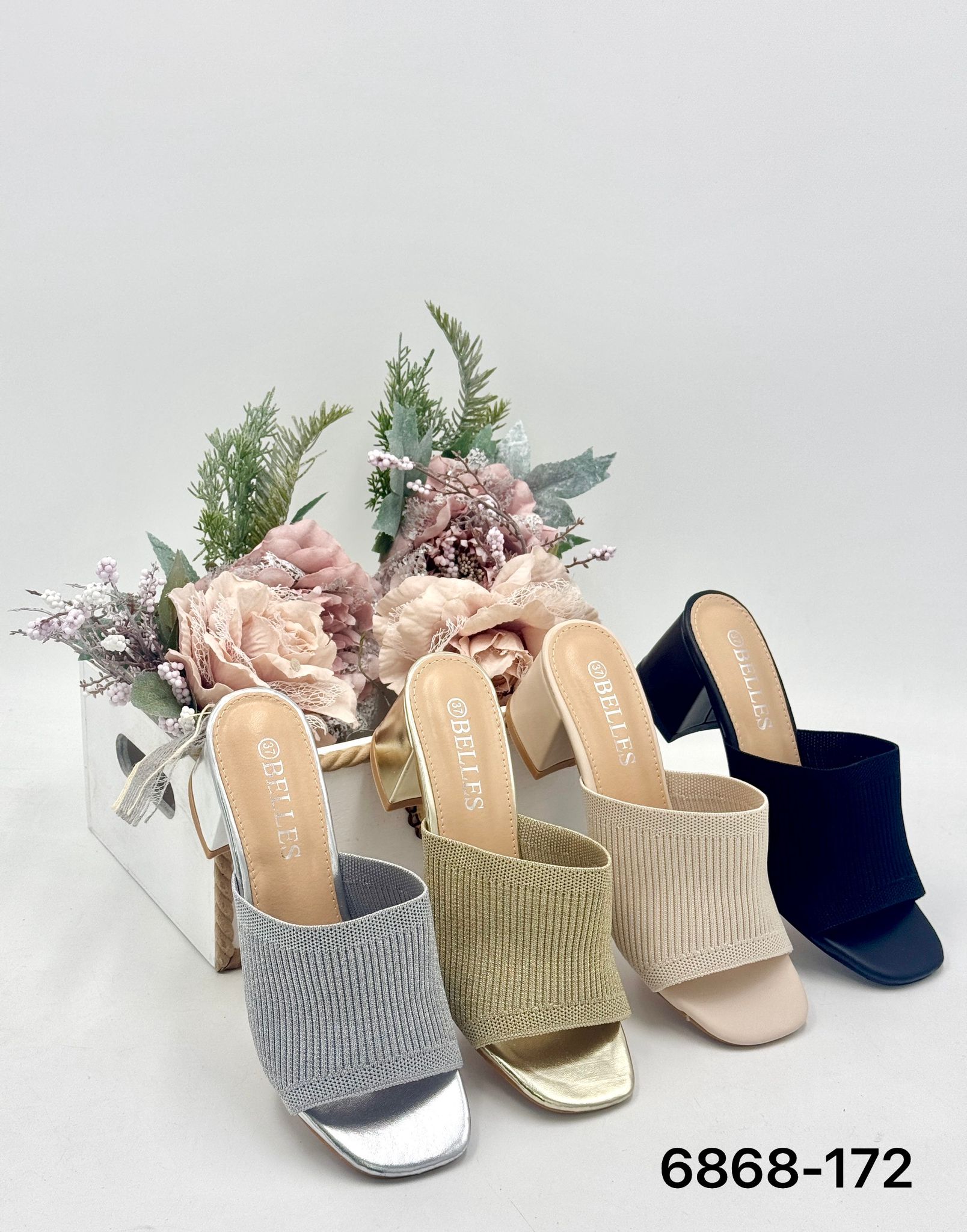 Elegantes zuecos de tejido elástico tipo canalé con tacón ancho cuadrado y punta cuadrada, perfectas para un look moderno y cómodo.