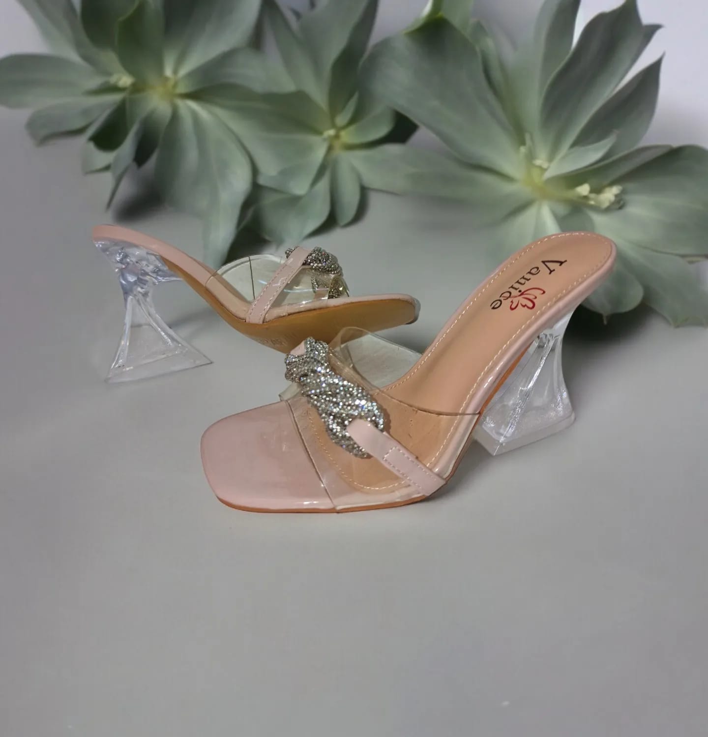 «Pisando fuerte con estos zuecos transparentes y un nudo de piedras, donde la elegancia se encuentra con la transparencia moderna.»