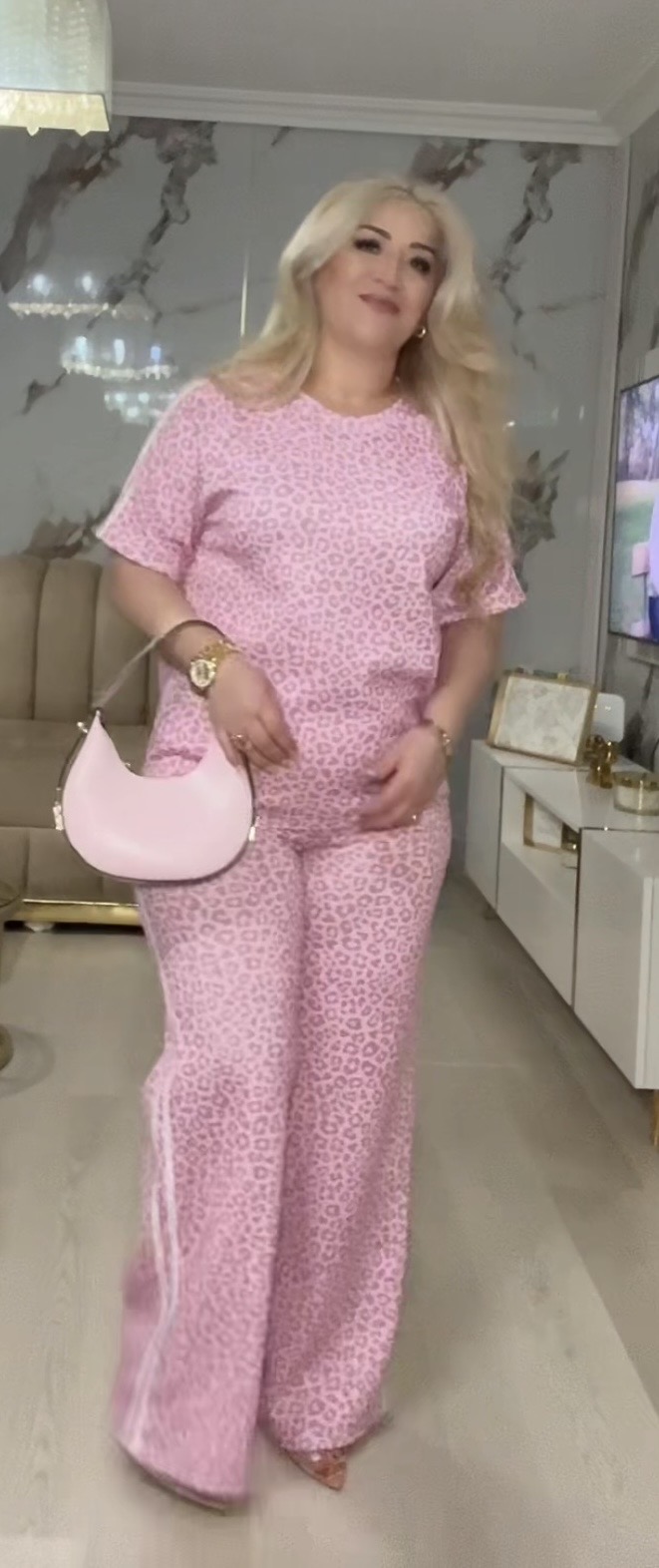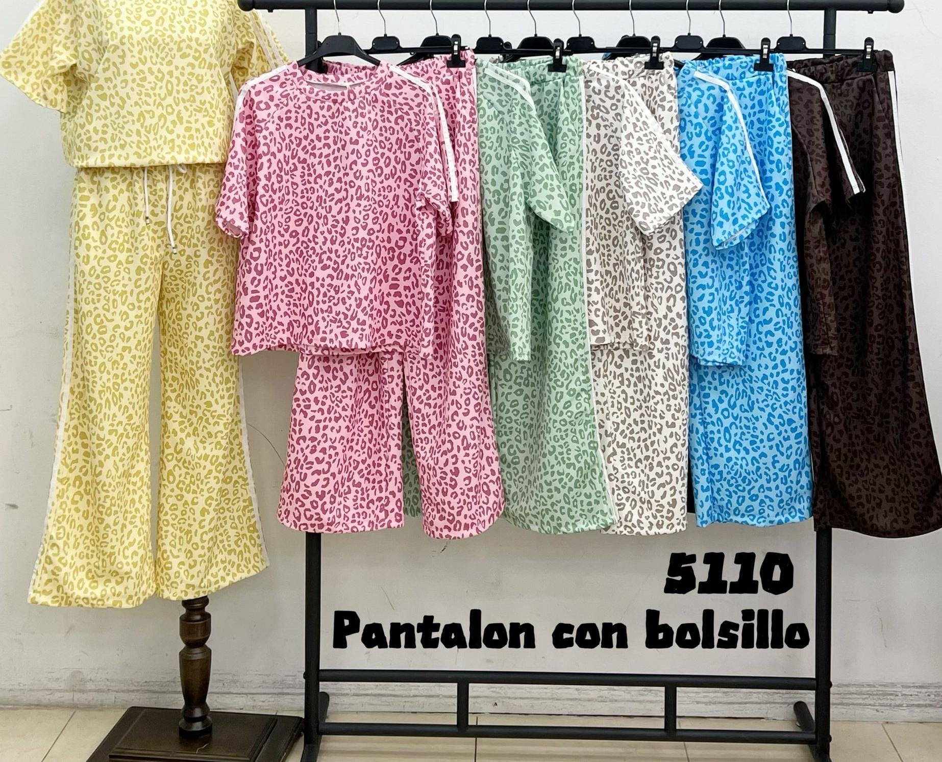 Diseño súper favorecedor con estampado tipo animal print suave, camiseta de manga corta y pantalón fluido con bolsillos