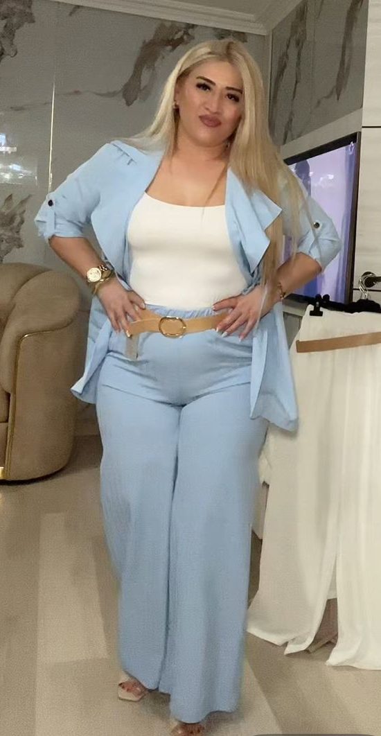 El set “Brisa Elegante” combina frescura y sofisticación en un diseño moderno de tres piezas: blazer ligero, top básico y pantalón de corte amplio. Su tono azul suave aporta luminosidad y estilo, mientras que su silueta fluida estiliza la figura sin sacrificar comodidad. Perfecto para elevar tus outfits diarios con un aire chic y profesional.