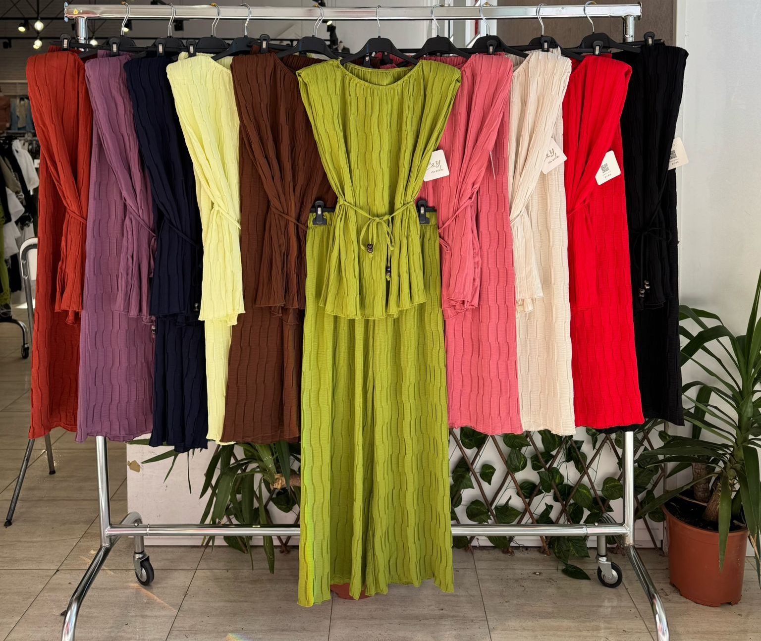 El conjunto redefine la comodidad con estilo. Diseñado en un tejido con relieve que aporta dimensión y un look moderno, incluye blusa de corte relajado y pantalón fluido con ajuste en cintura para mayor versatilidad. Su diseño ligero y fresco lo convierte en la opción ideal para días activos sin perder elegancia.