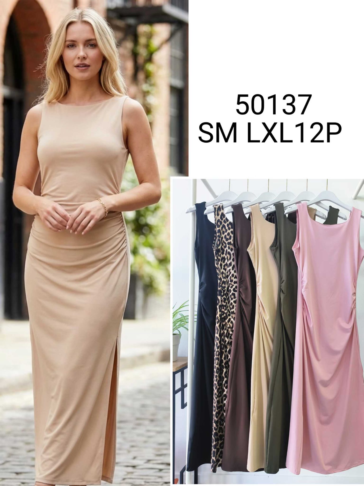 Vestido de diseño elegante y minimalista, confeccionado en tela suave y elástica que se adapta perfectamente a la silueta. Cuenta con cuello redondo, corte sin mangas y detalle de fruncido lateral que estiliza la figura, acompañado de una sutil abertura que aporta un toque moderno y femenino. Ideal para looks casuales o para ocasiones especiales. Disponible en varios colores y estampados.