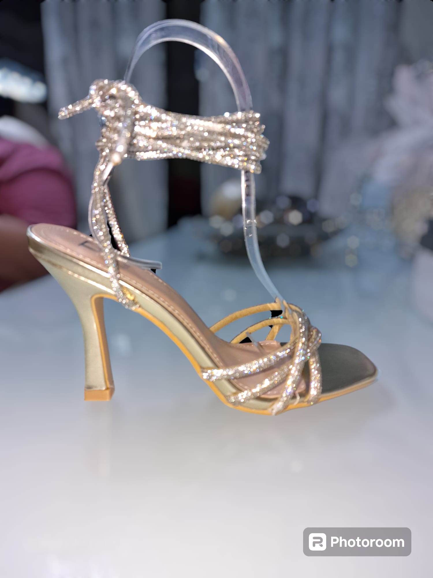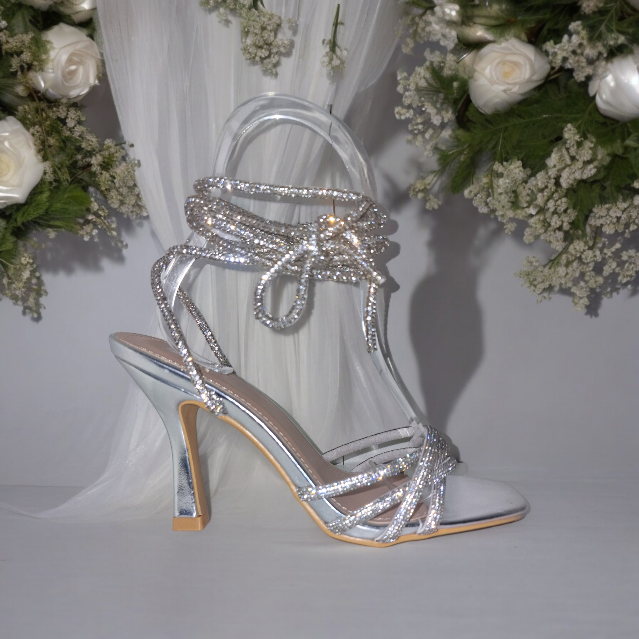 La sandalia plata con cuerdas brillantes atada a la pierna es una opción elegante y llamativa para complementar cualquier outfit de verano.