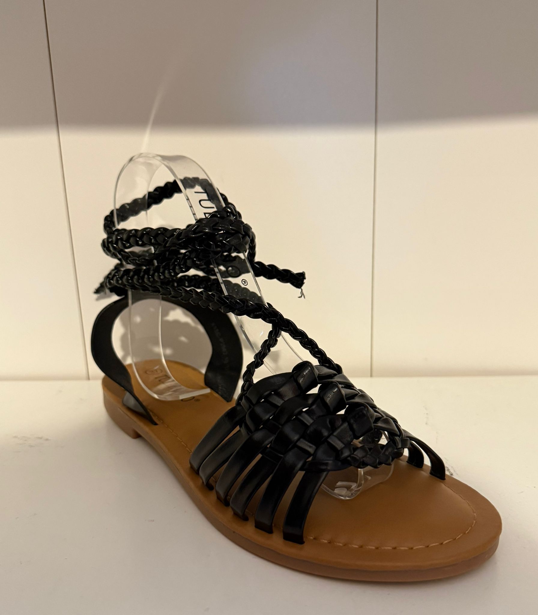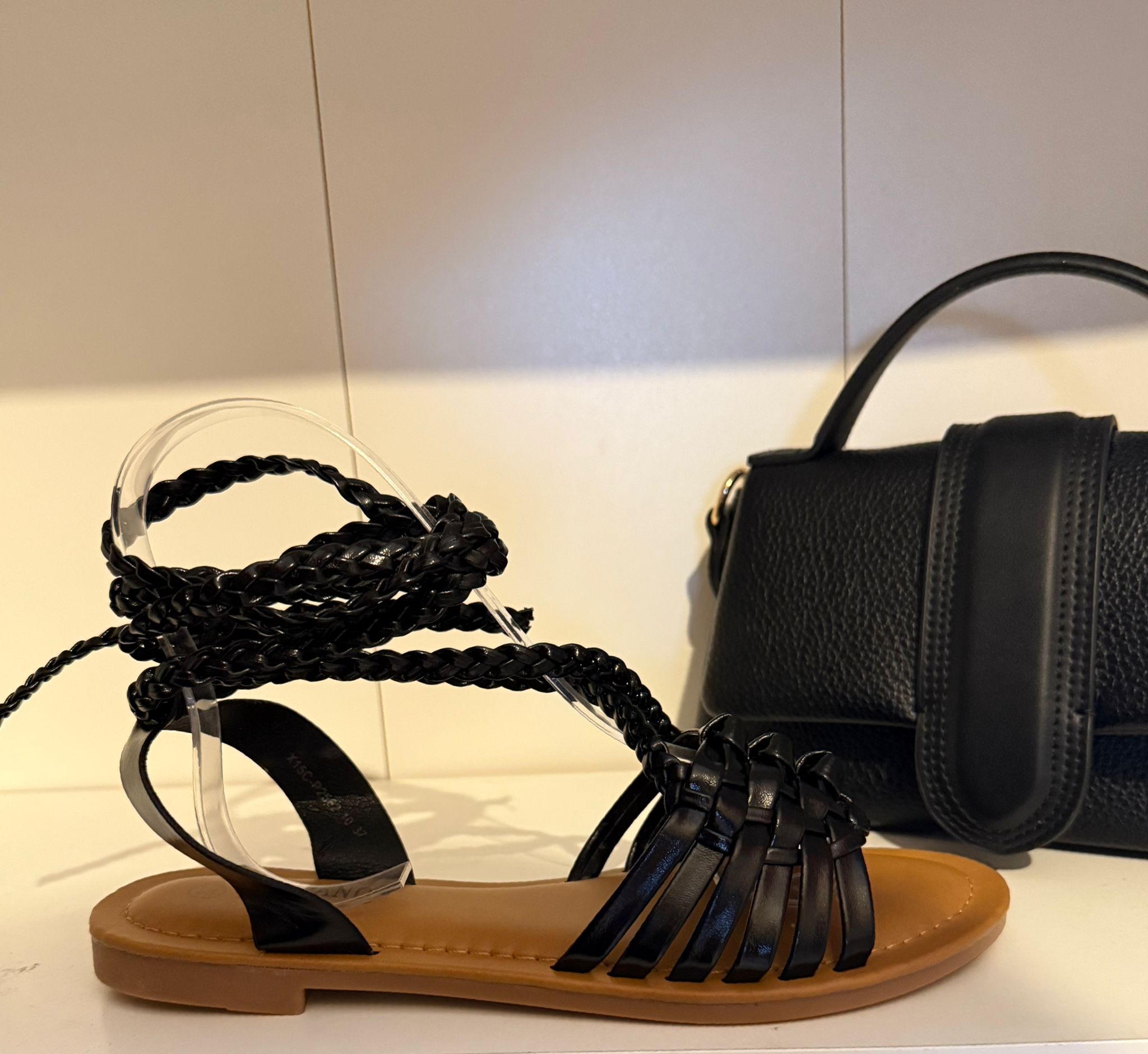 Combinan un estilo fresco y versátil. Con tiras entrelazadas en acabado negro brillante y cordones trenzados que se atan al tobillo, estas sandalias aportan un look bohemio y sofisticado a la vez.