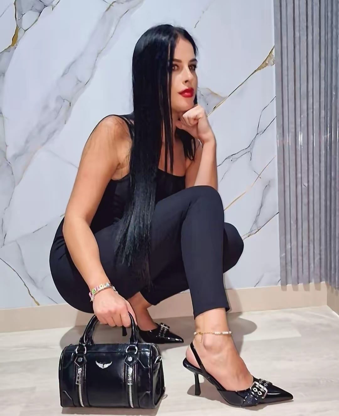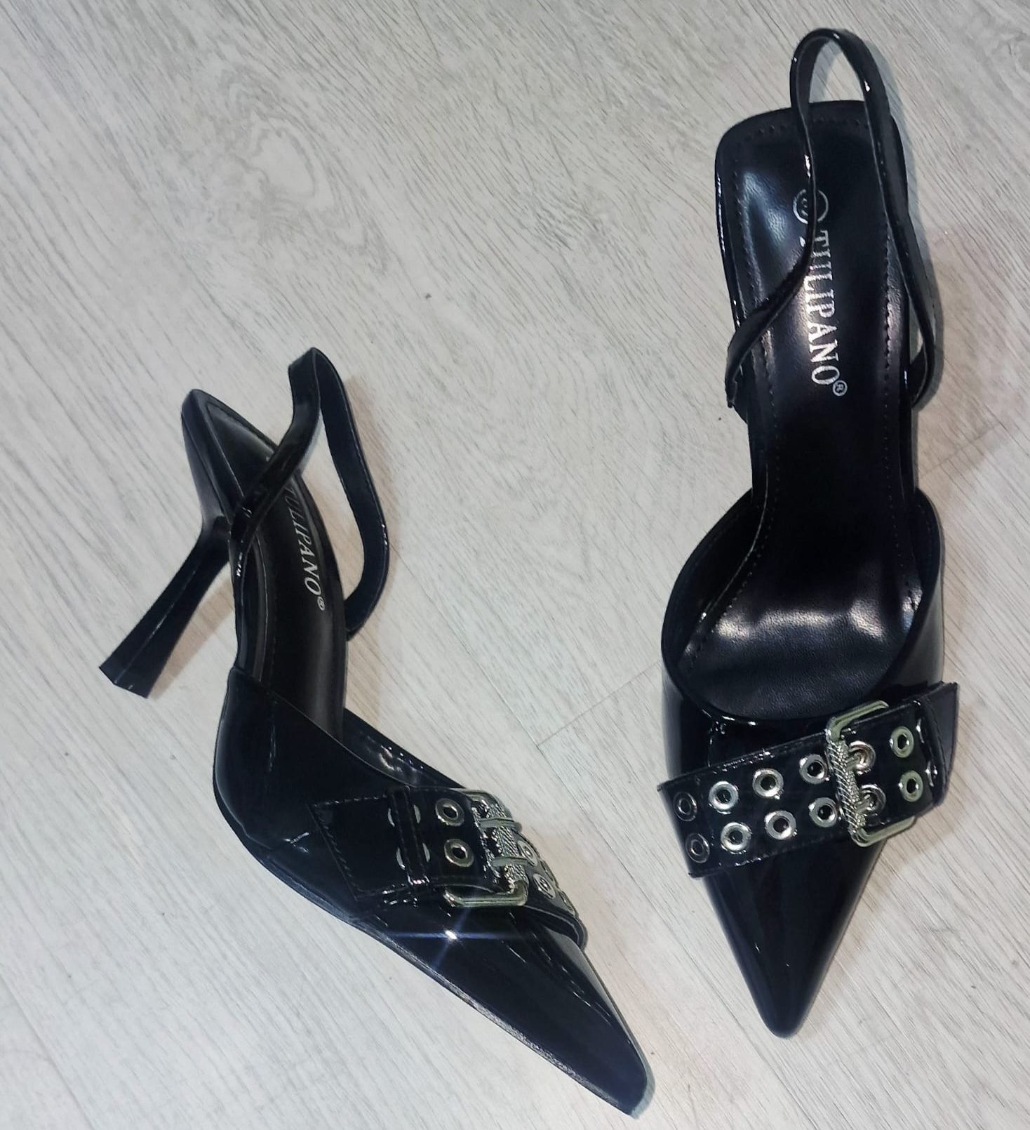 Unos elegantes stilettos en charol negro, con punta fina y tacón alto estilizado. Incorporan un diseño moderno con correa cruzada al talon y una hebilla metálica con ojales plateados en la parte frontal , aportando un toque rock chic y sofisticado. Perfectos para elevar cualquier look, desde un outfit de noche hasta un conjunto urbano con estilo atrevido.