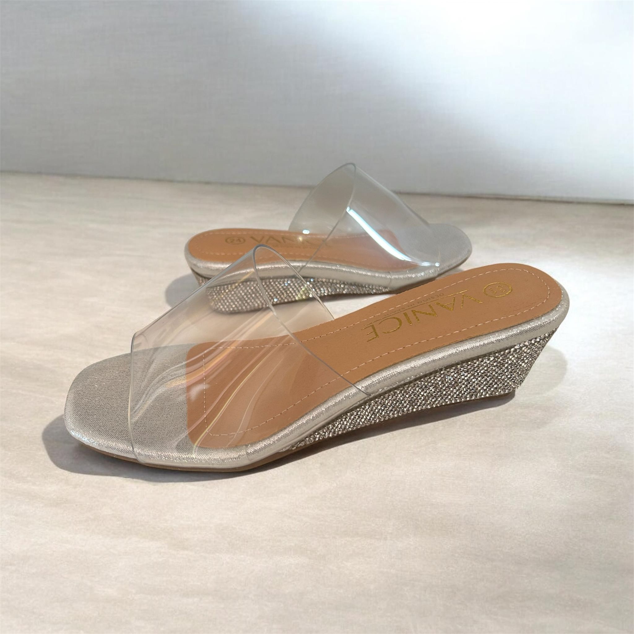 Diseño moderno con acabado brillante y banda transparente que aporta un efecto ligero y elegante. Su tono plateado ilumina cualquier outfit, ideal para ocasiones especiales o para elevar looks casuales. Un equilibrio perfecto entre frescura, glamour y comodidad.