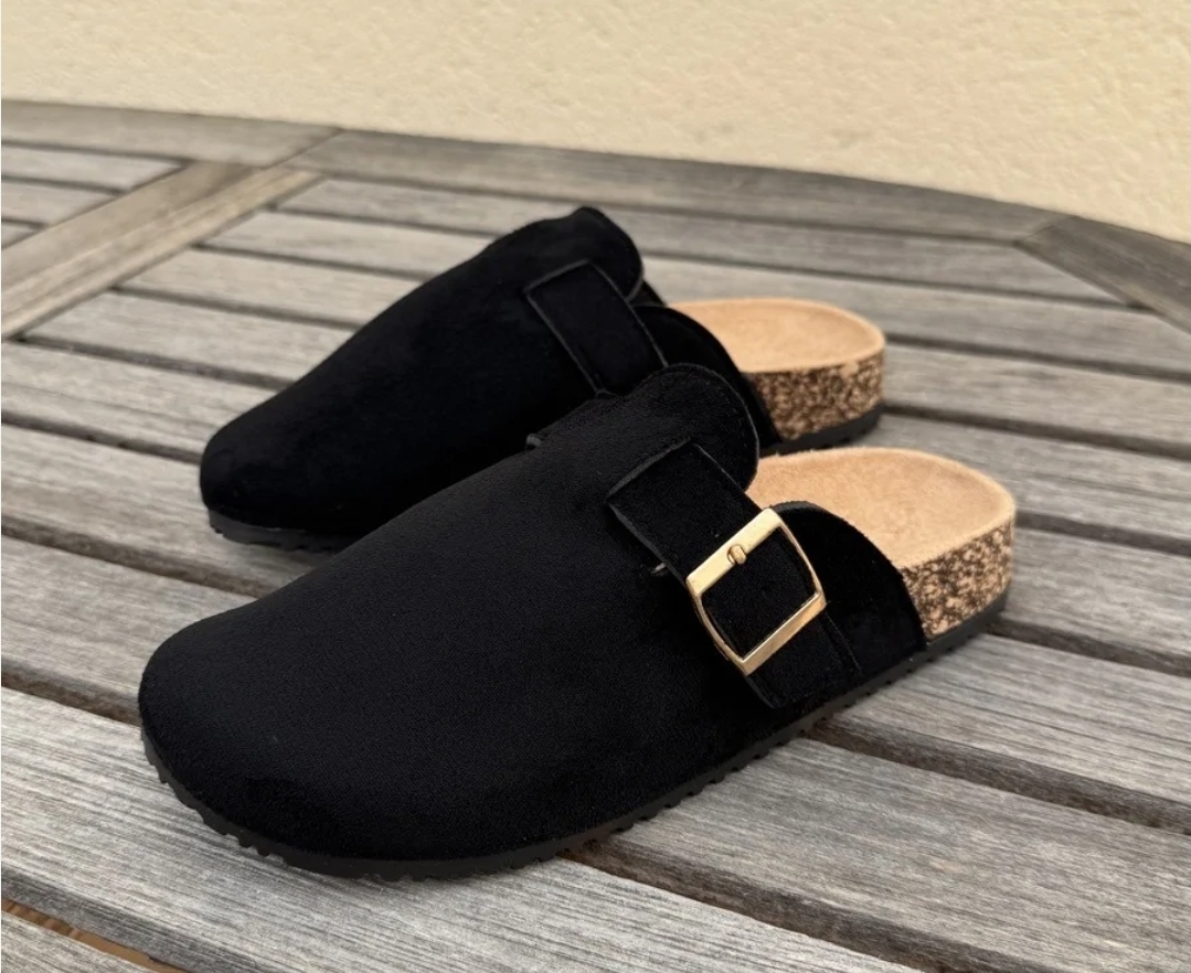 Comodidad y estilo se unen en nuestros zuecos AFRICA CONFORT. Con su acabado aterciopelado en negro y una elegante hebilla dorada, son eprfectos para lucir con cualquier look casual o de descanso.