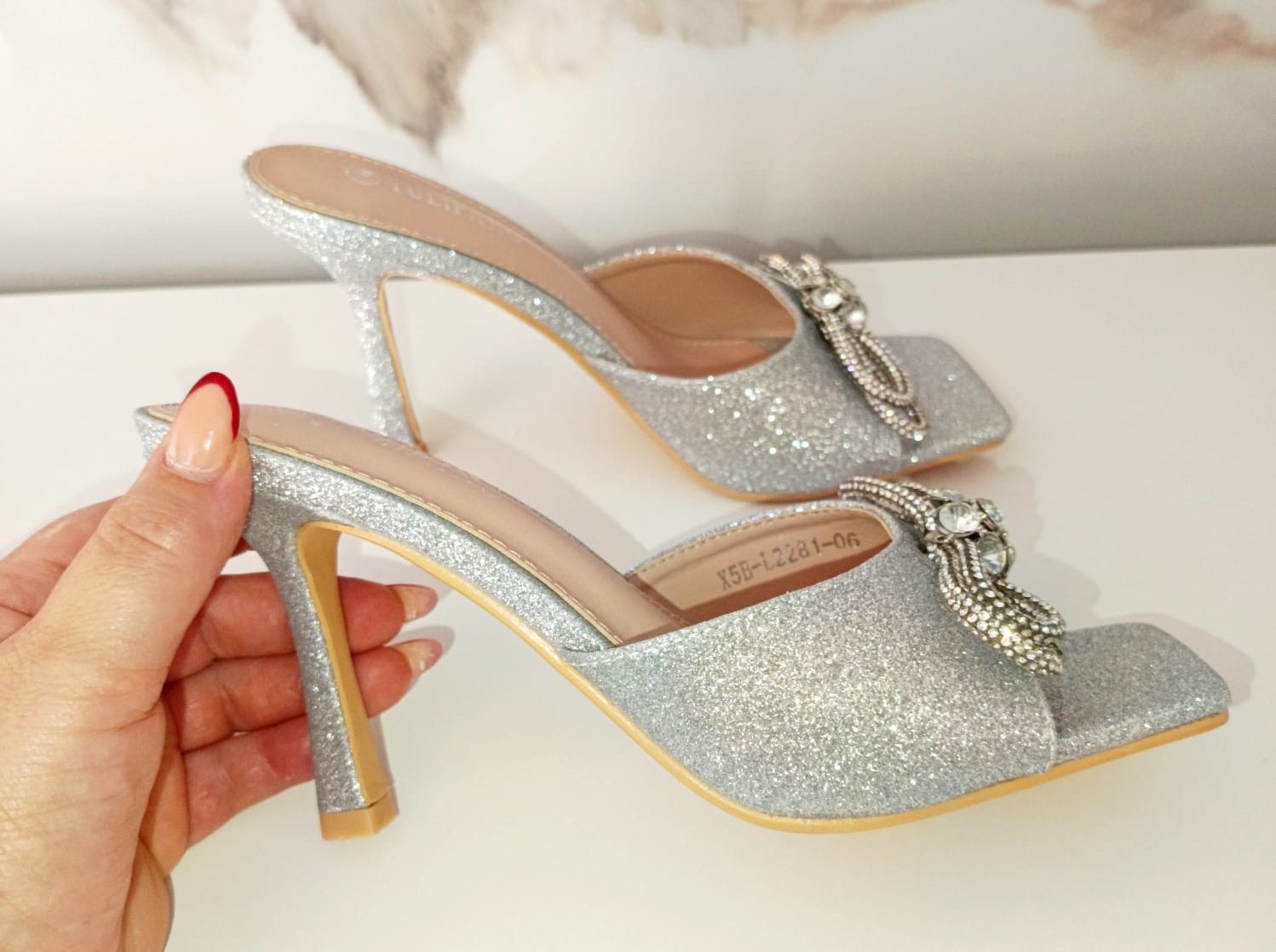 Elegante mule negro con acabado brillante y tacón alto cuadrado. Su diseño destaca por el lazo joya en pedrería y cristales que aporta un toque sofisticado y glamuroso. Perfecto para combinar con vestidos de noche, eventos especiales o dar un aire distinguido a un look moderno.