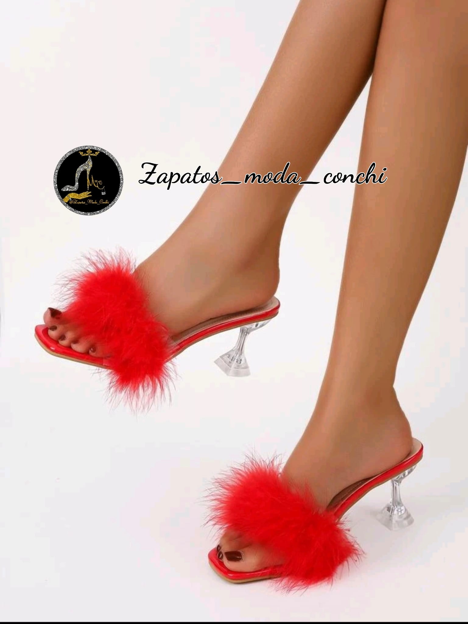 Luce estilosa con el zueco Ana de plumas disponible en rojo, negro y rosa con tacón de copa bajo.